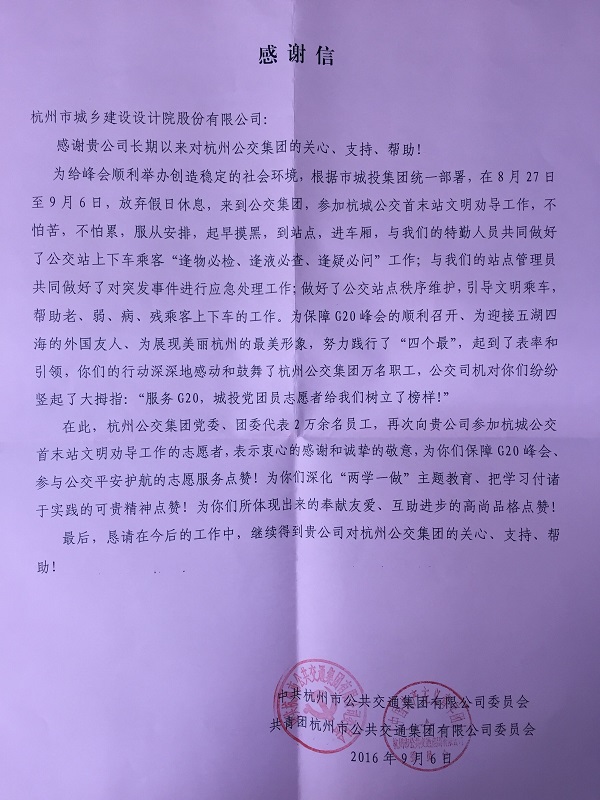 9月20日下午,杭州市城市建設(shè)投資集團(tuán)有限公司團(tuán)委副書記和杭州市公共交通集團(tuán)有限公司團(tuán)委書記專程將一封感謝信和一面錦旗交到公司領(lǐng)導(dǎo)手中。為杭設(shè)股份的志愿者們在G20峰會保障工作期間,參與公交平安護(hù)航志愿服務(wù)點贊。公司董事長高重建和副院長康平接受錦旗,并且表示今后將一如既往發(fā)揚志愿服務(wù)精神工作。為美麗杭州、魅力杭州,添光加彩。